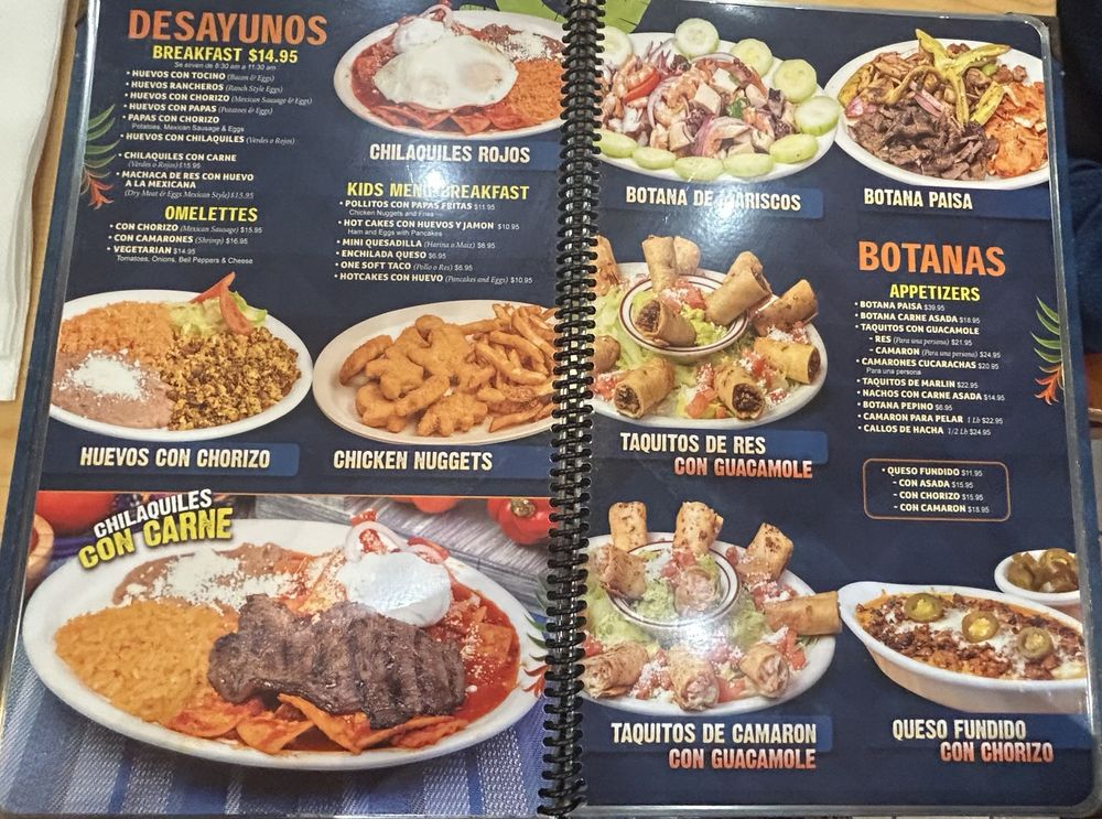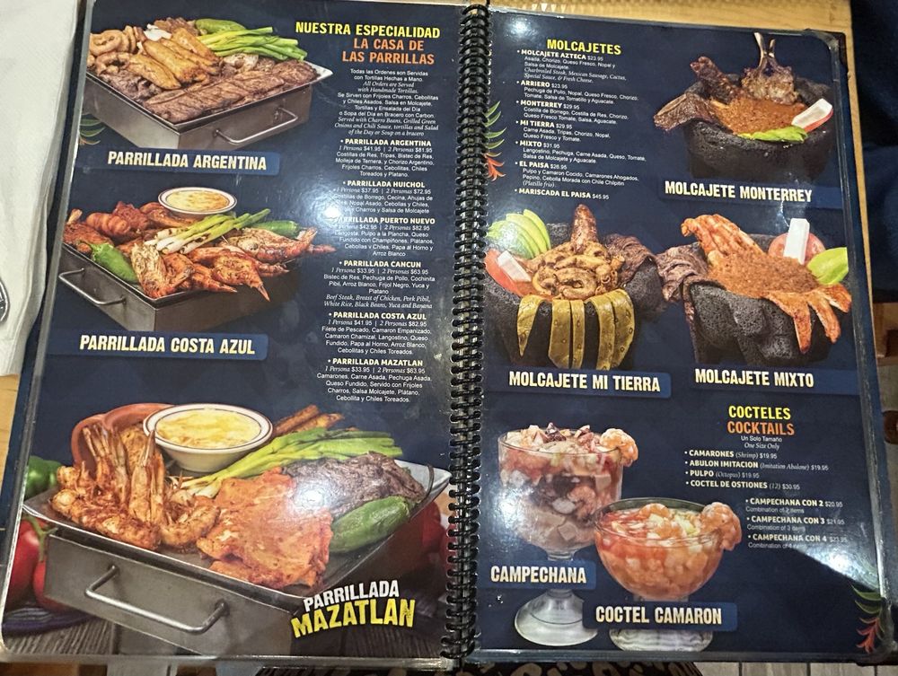 Camarones , carne asada, pechuga asada, queso fundido, servido con frijoles charros, salsa molcajete, platano, cebollitas y chiles toreados. Todas las ordenes son servidas con tortilla hecha a mano. All orders are served with hand made tortillas. Todas las ordenes son servidas con tortilla hecha a mano. All orders are served with hand made tortillas.