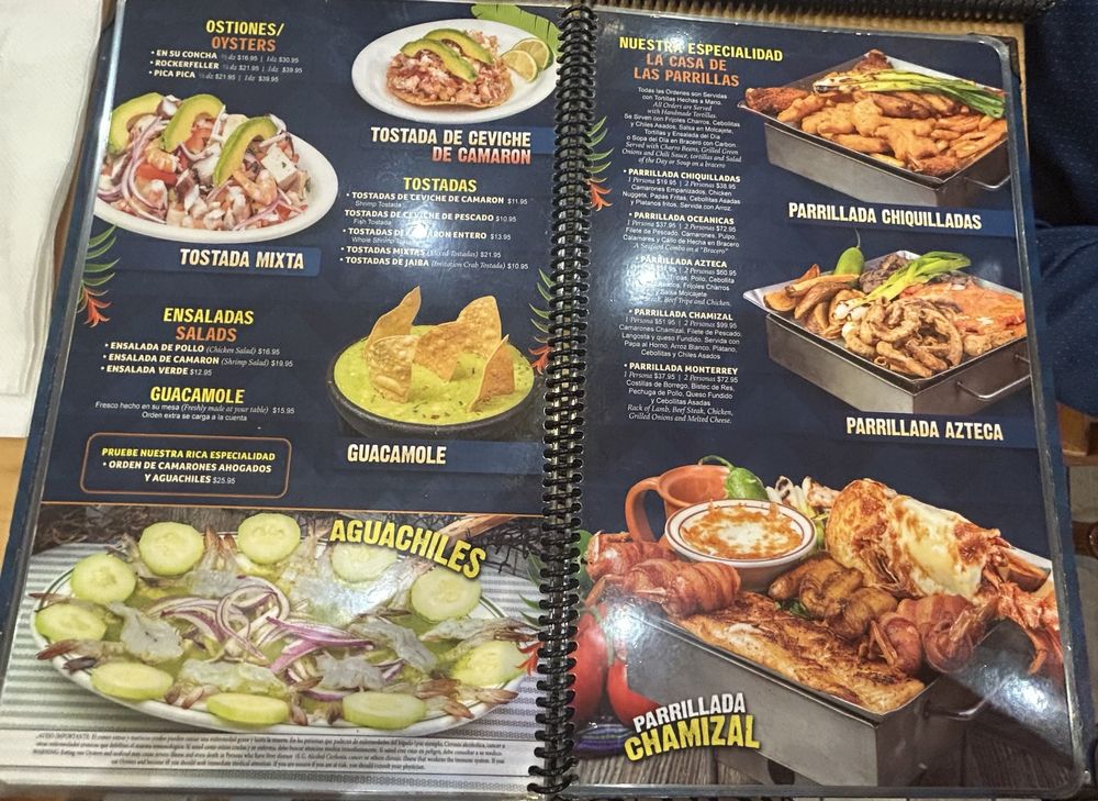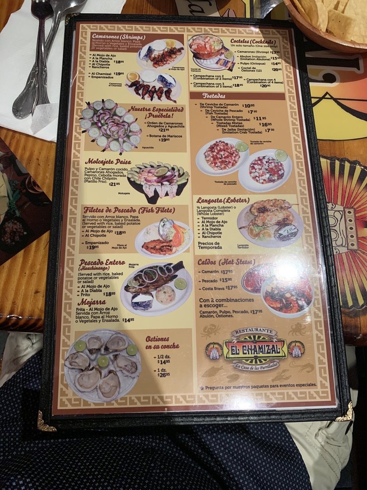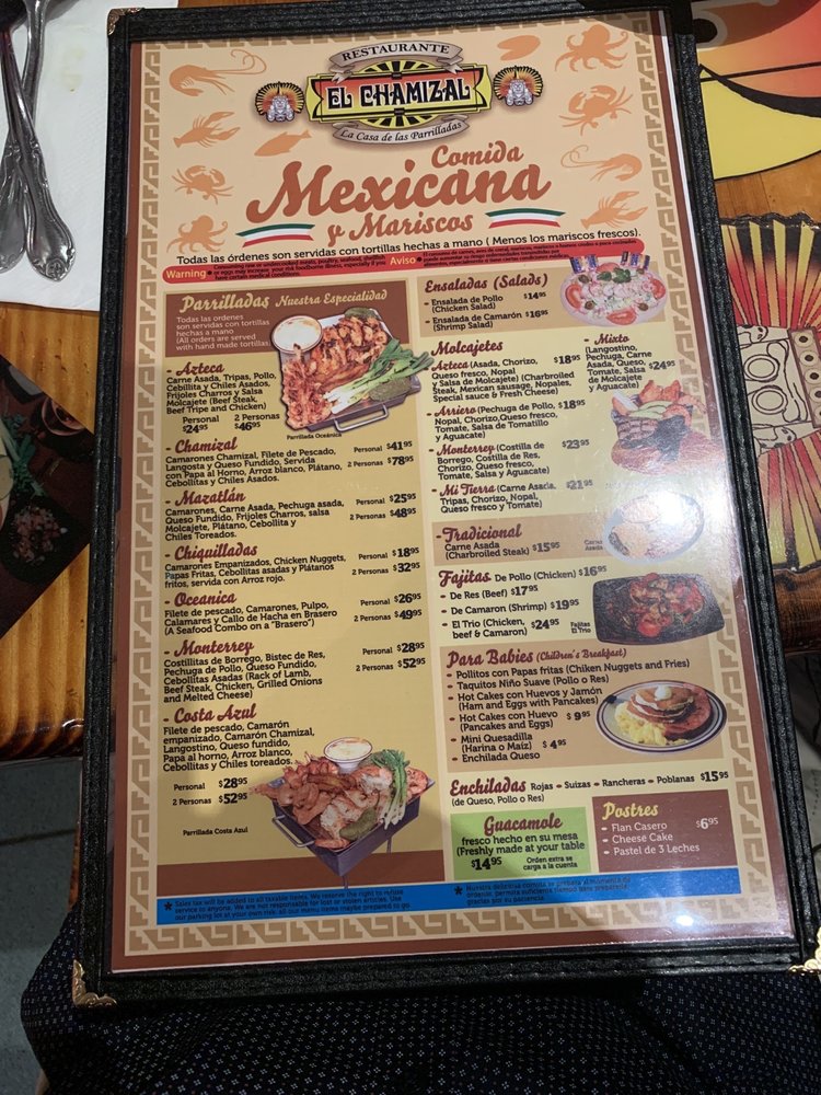 Filete de pescado, camarn empanizado, camaron chamizal, langostino, queso fundido, papa al horno, arroz blanco, cebollitas y chiles toreados. Todas las ordenes son servidas con tortilla hecha a mano. All orders are served with hand made tortillas.