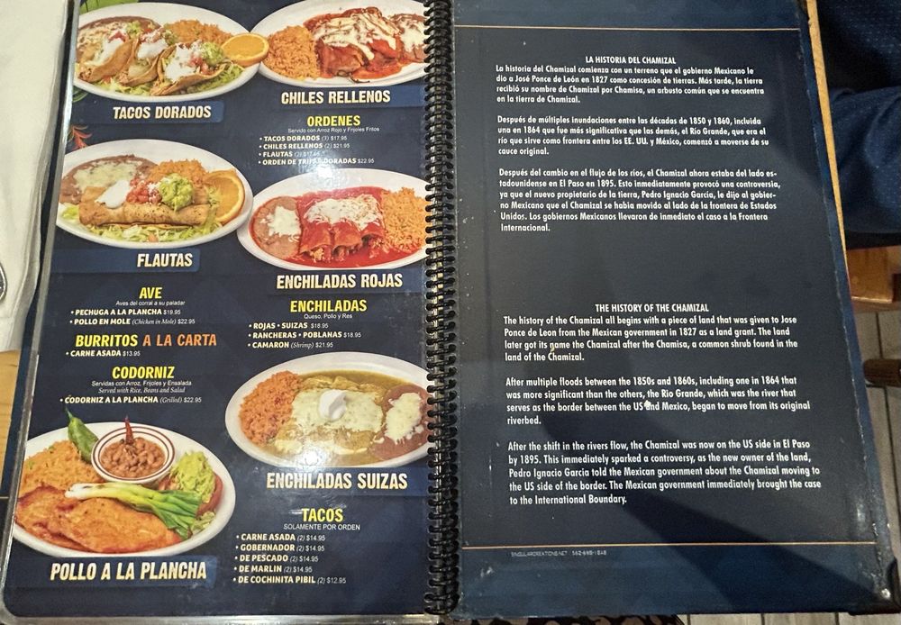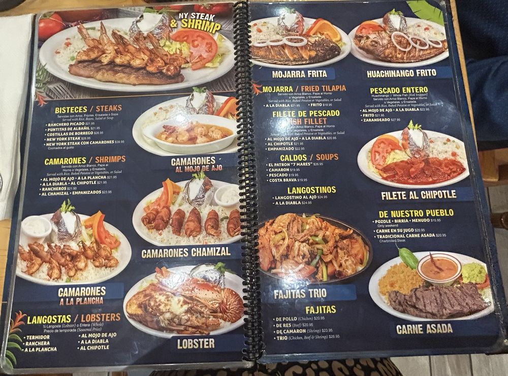 Camarones chamizal, filete de pescado, langosta y queso fundido servido con papa al horno, homo, arroz blanco, platano, cebollitas y chiles asados. Todas las ordenes son servidas con tortilla hecha a mano. All orders are served with hand made tortillas.